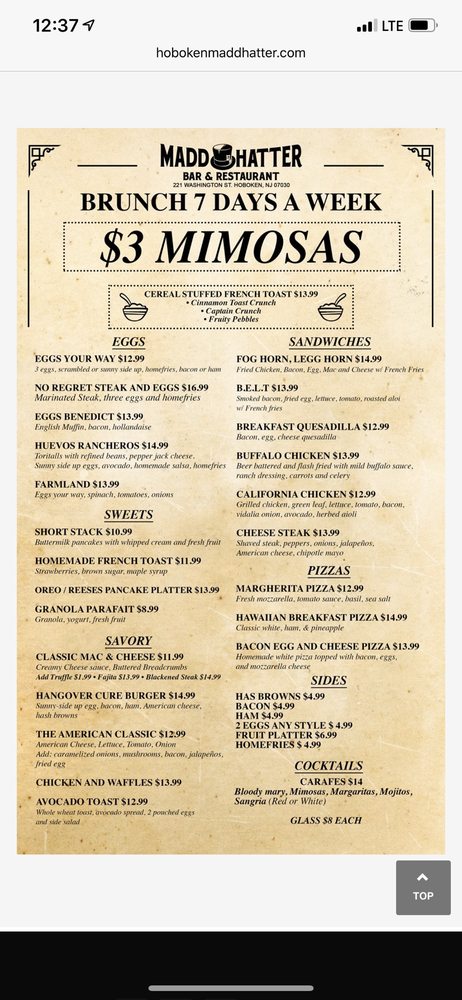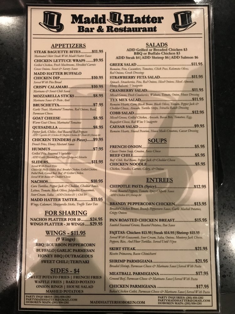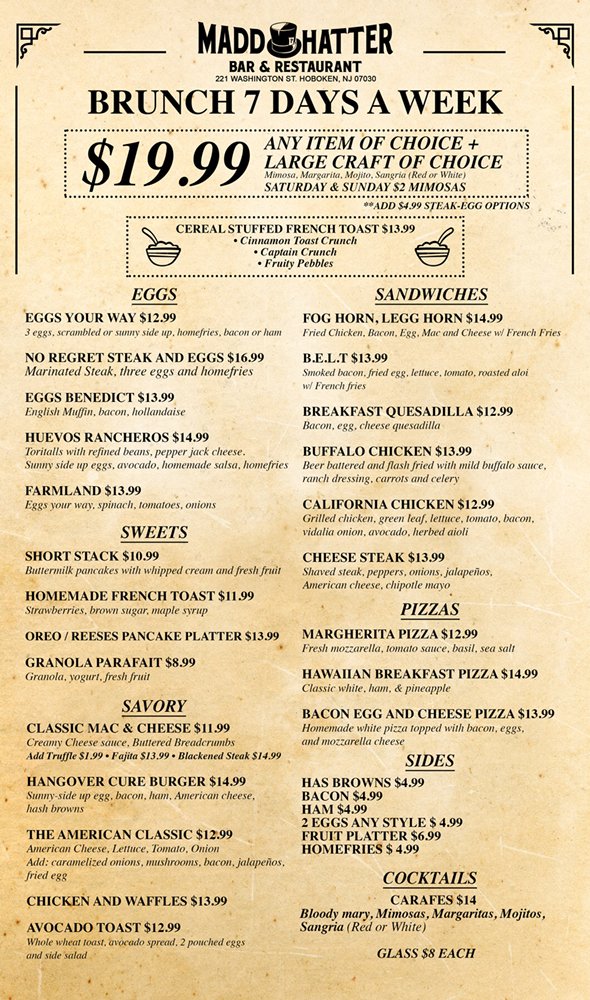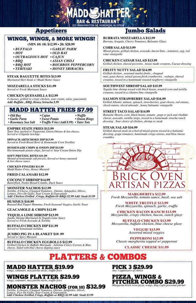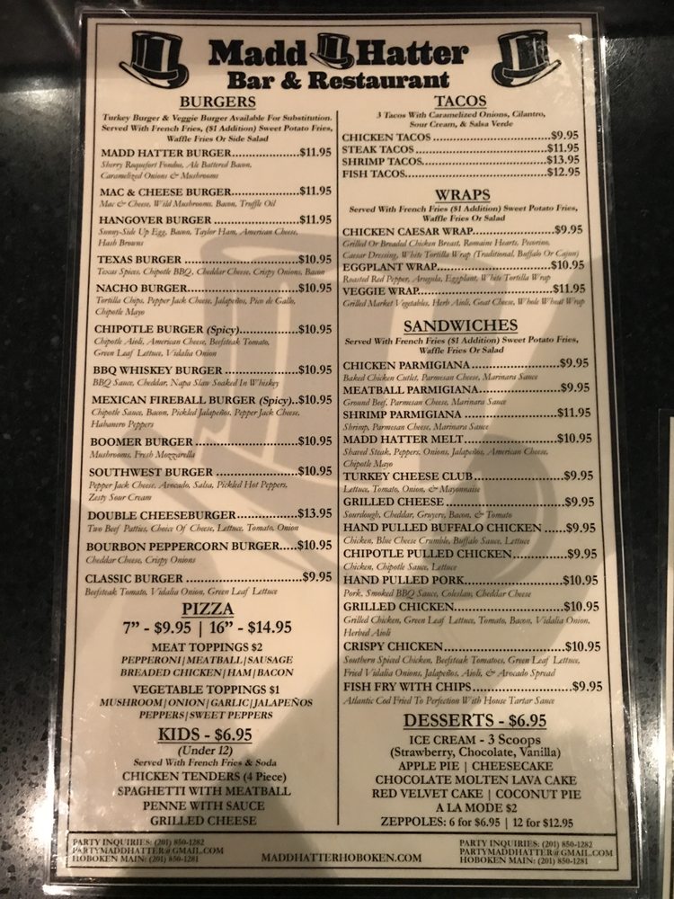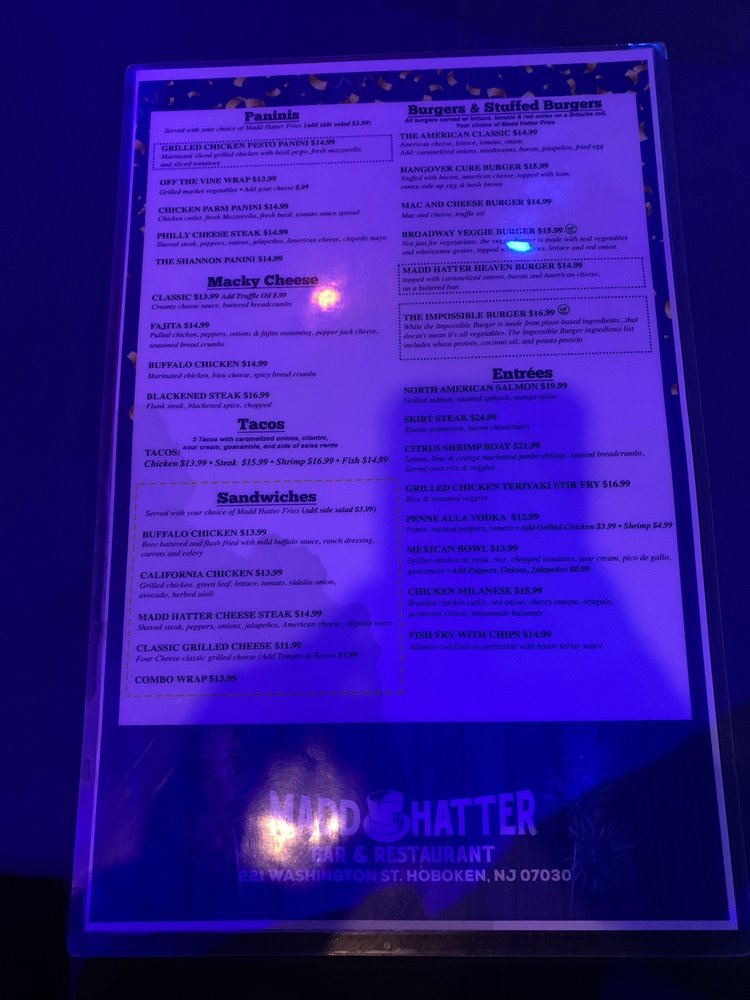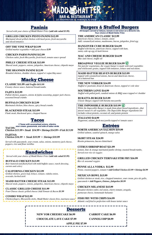 Madd Hatter, a vibrant sports bar located in Hoboken, offers a diverse menu with options for every palate. From savory dishes like the Hangover Cure Burger and Chicken Bacon Ranch Wrap to sweet treats like Cinnamon Stuffed French Toast and Oreo Pancake Platter, there is something for everyone to enjoy. The atmosphere is casual and trendy, perfect for a night out with friends or family. Customer reviews highlight the friendly staff, great prices, and vibrant atmosphere. With vegan and vegetarian options available, Madd Hatter caters to a wide range of dietary preferences. Don't miss out on their signature cocktails and happy hour specials, making it a favorite spot for locals and tourists alike. Experience the eclectic charm of Madd Hatter and indulge in a unique dining experience unlike any other.